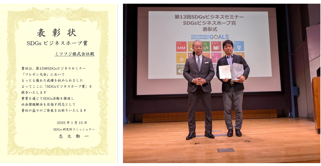 この度、SDGs研究所と株式会社ワイズが共催するSDGsビジネスセミナーのプレゼン大会に当社代表取締役社長の三寺が登壇し、「SDGsビジネスホープ賞」を受賞しました。今後も高い価値を持つサービスの提供により社会・顧客の課題解決と、持続可能性のある社会の実現を目指します。