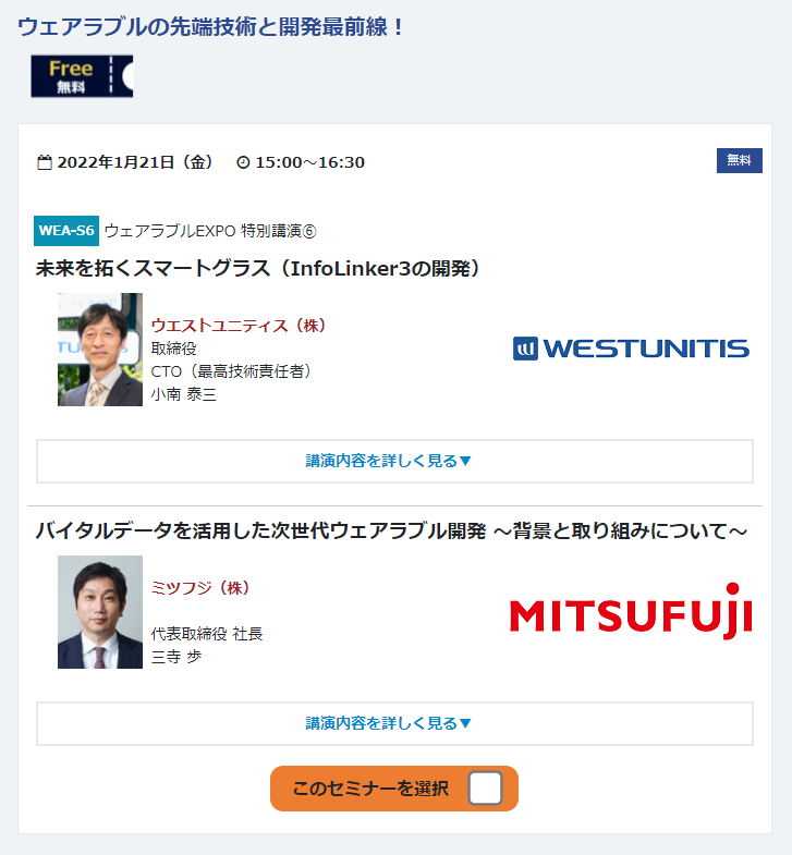 明日19日~21日に開催される同イベントにて、「ウェアラブルの先端技術と開発最前線!」をテーマにした無料セミナーに当社代表取締役社長の三寺が登壇します。