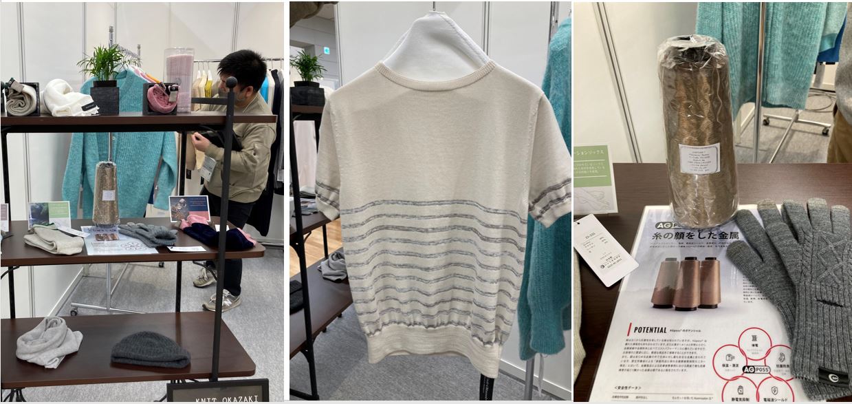 東京都立産業貿易センターに本日開催中のJAPAN BEST KNIT SELECTION2021(ニットテキスタイル業界向け展示会)のニットオカザキ様のブースにて、当社の銀めっき導電性繊維AGpossを使ったアパレル、靴下、手袋などを展示いただいております。