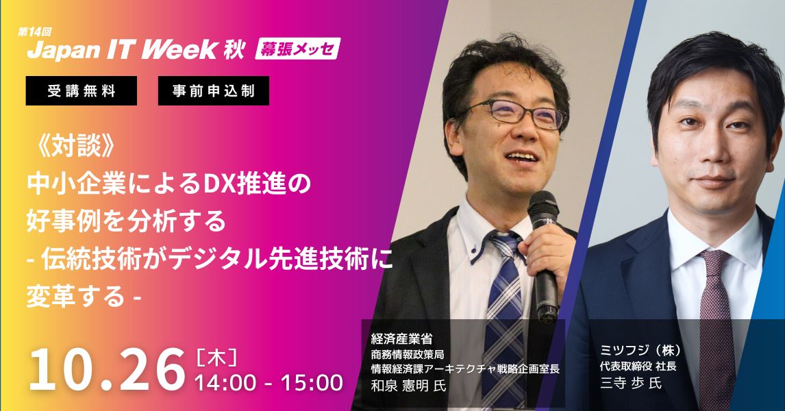 2023年10月25日(水)-10月27日(金)まで幕張メッセにて開催予定の「第14回Japan IT Week秋」のセミナー特別講演に、経済産業省の和泉憲明様と共に、当社代表取締役の三寺が登壇します。